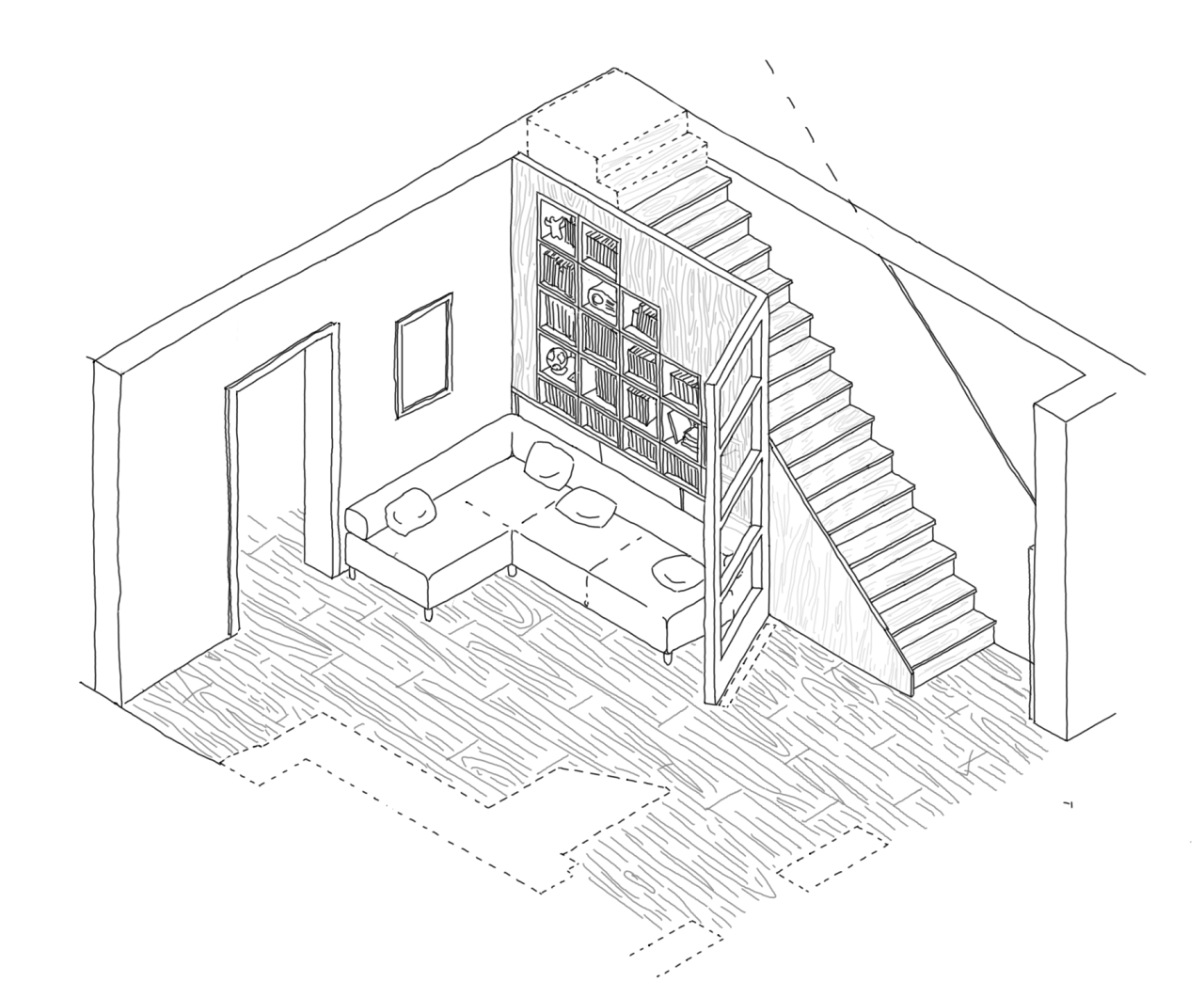 La nouvelle isolation venant réduire la hauteur sous plafond dans l'ensemble des espaces, le chien assis au centre du logement devient élément principal : il comprend ainsi l'arrivée de l'escalier, et la cloison de la salle de bain vient se positionner en biais afin d'y installer la porte de la salle de bain, le bureau, ou encore une bibliothèque.