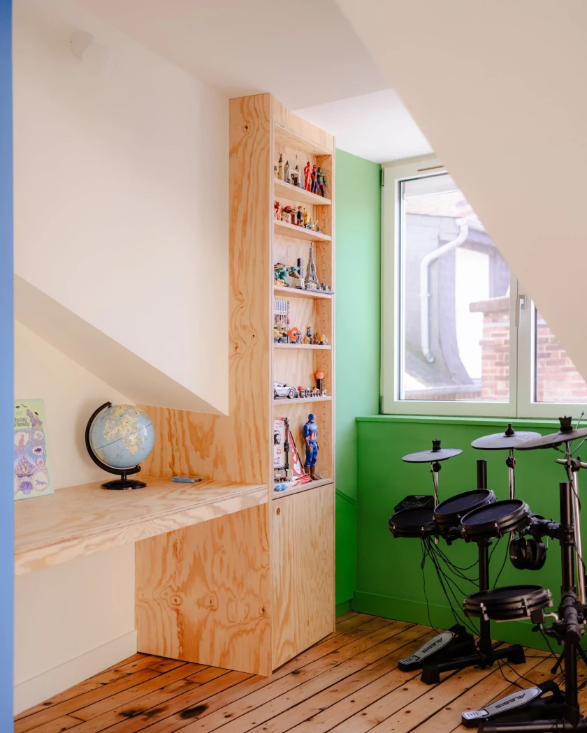 Suite au rachat d'un studio situé à l'étage supérieur, la famille souhaite profiter de cette surface supplémentaire pour créer un duplex et installer une chambre et salle de bain pour leur fils dans les combles.