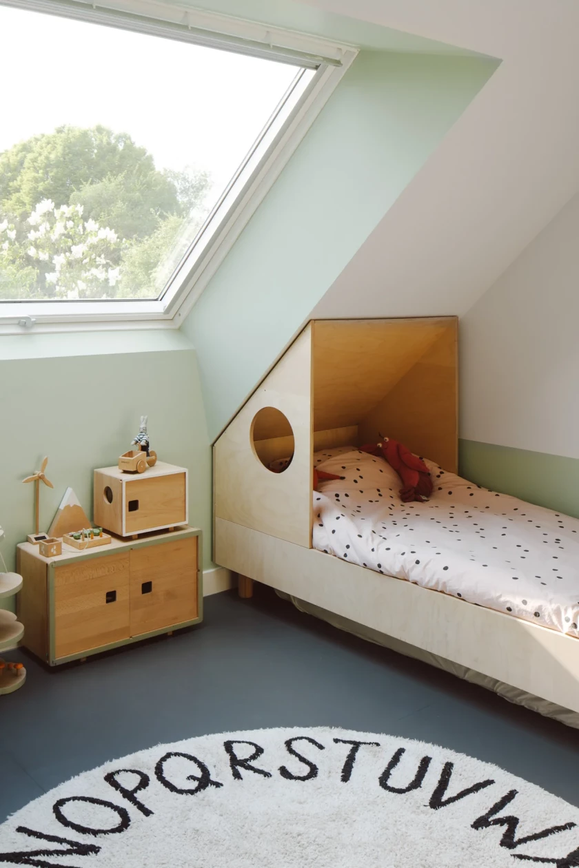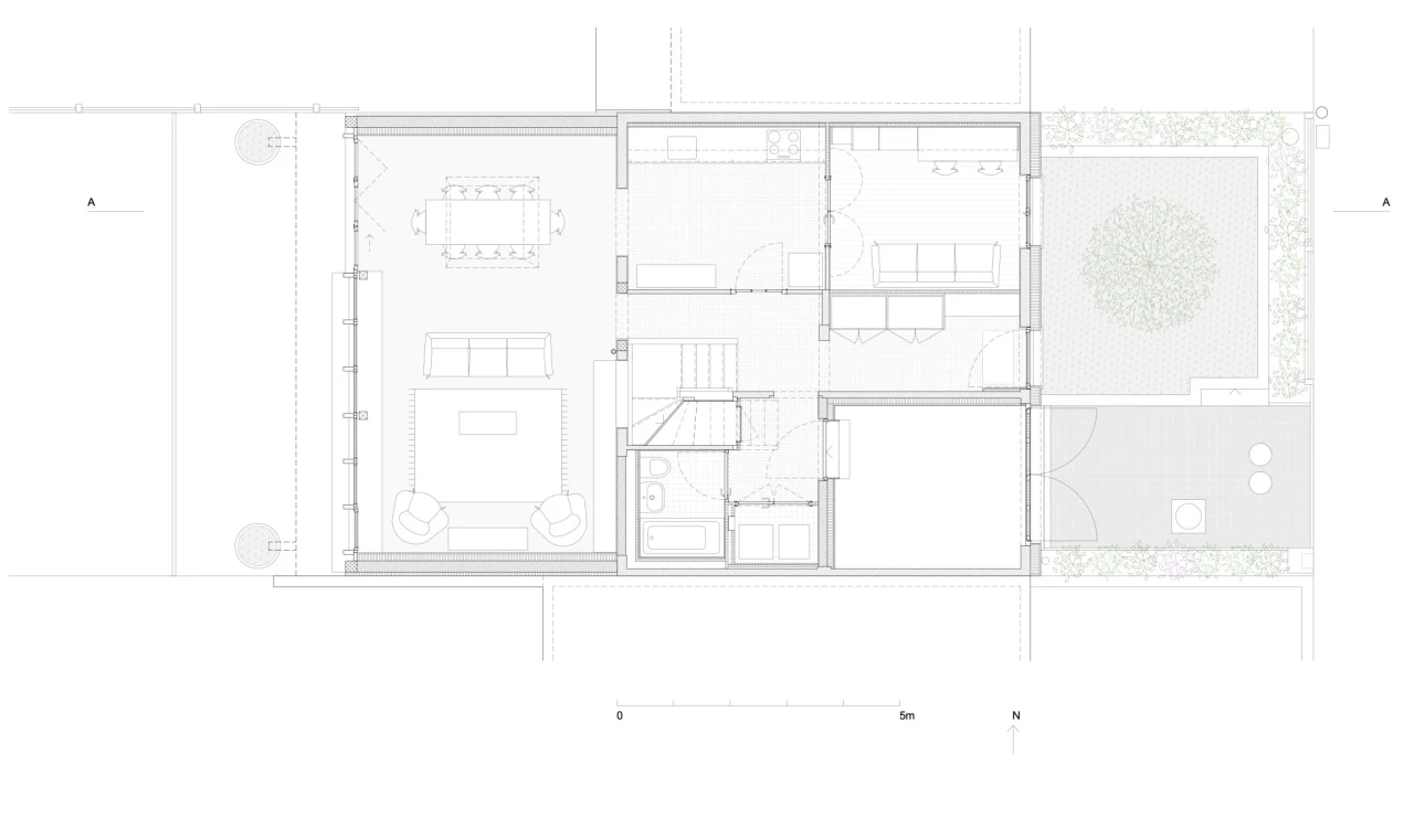 Au souhait d’un salon, proposition est faite d’une extension d’un seul niveau, développée sur toute la largeur de la parcelle. Celle-ci s’ouvre entièrement sur le jardin, sa toiture avancée est la prolongation de la nouvelle couverture de la maison originale. La typologie générale de la maison est retravaillée avec minutie, les circulations deviennent plus fluides et de nouvelles percées viennent aérer l’ensemble auparavant très engoncé. Une salle de bain et trois chambres optimisées s’installent à l’étage, permettant à chaque enfant d’avoir en grandissant un espace à lui. Côté boulevard, une plateforme surélevée, ceinturée d’une haie composée d’espèces indigènes, permet de franchir un seuil vers la sphère privée de la maison.