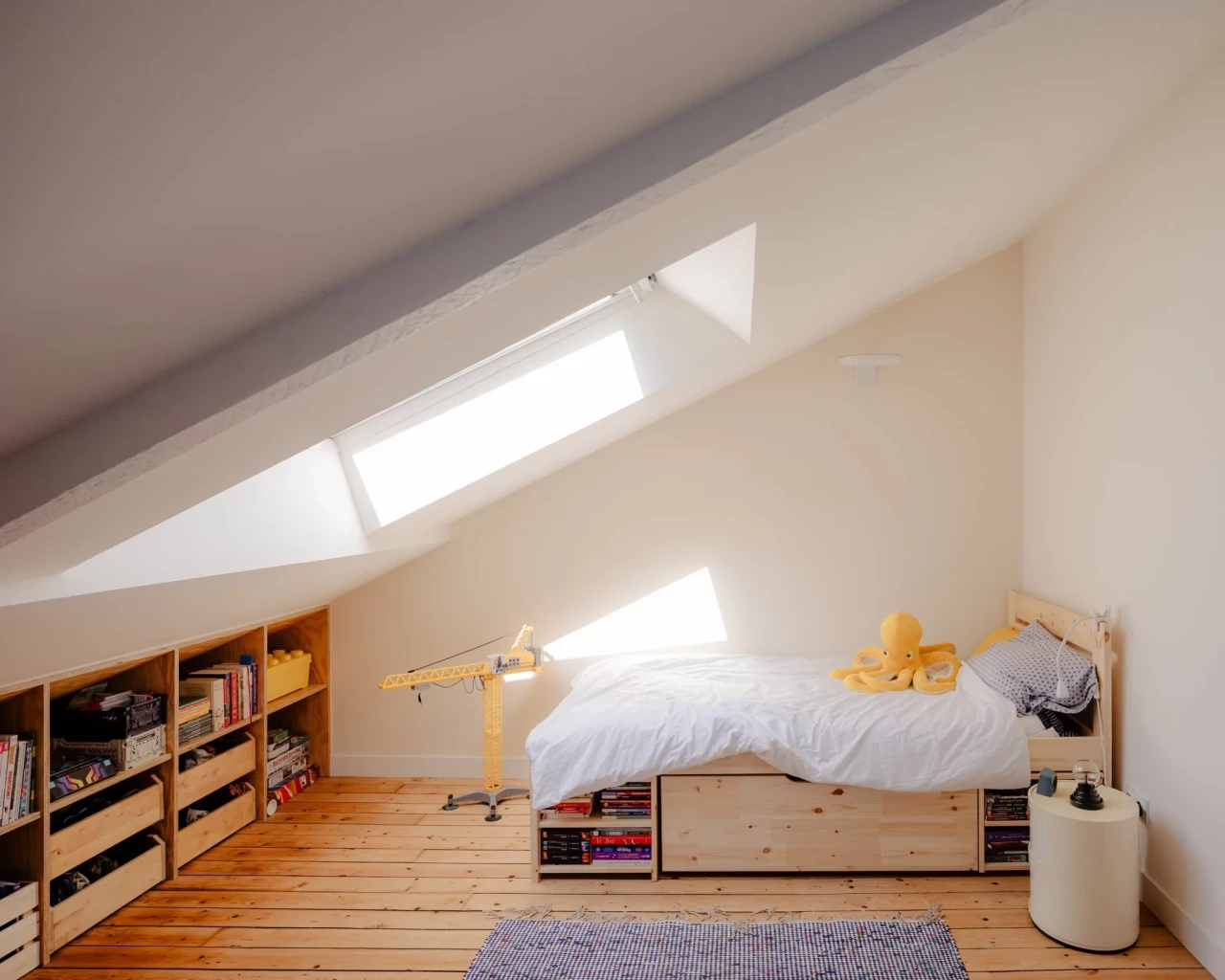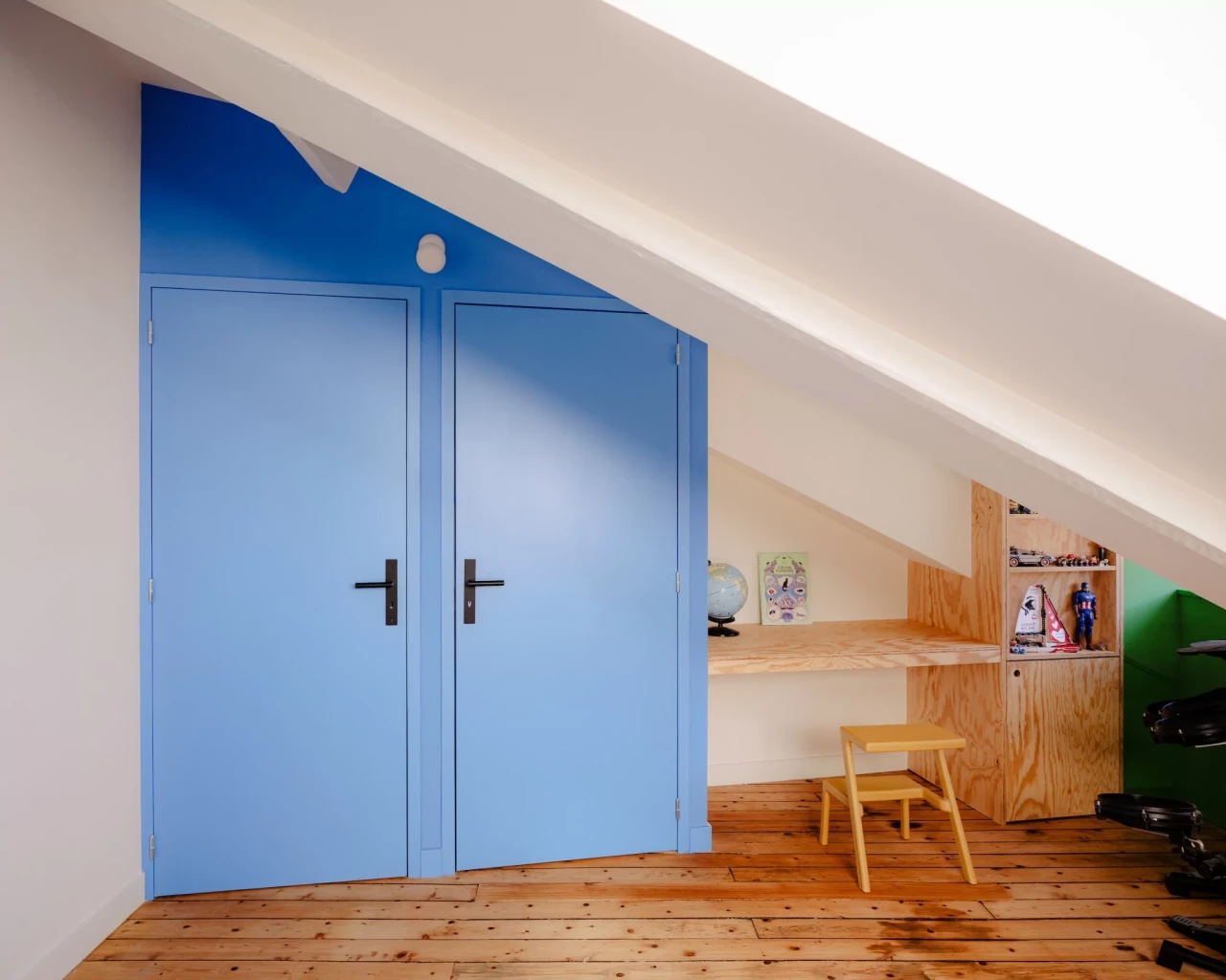 Suite au rachat d'un studio situé à l'étage supérieur, la famille souhaite profiter de cette surface supplémentaire pour créer un duplex et installer une chambre et salle de bain pour leur fils dans les combles.