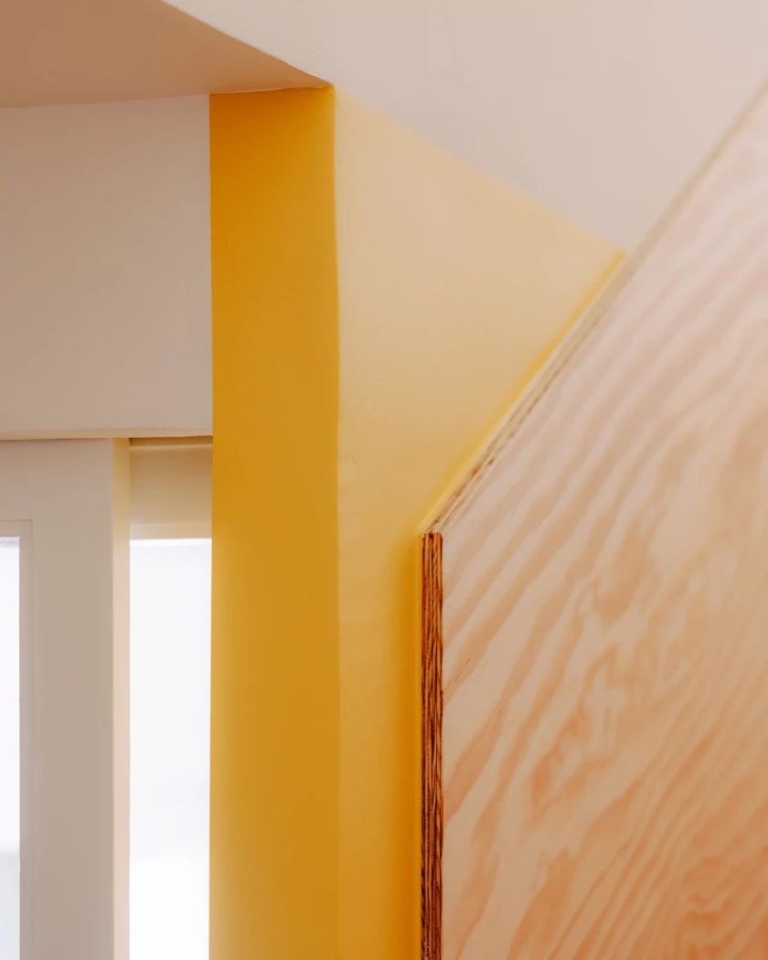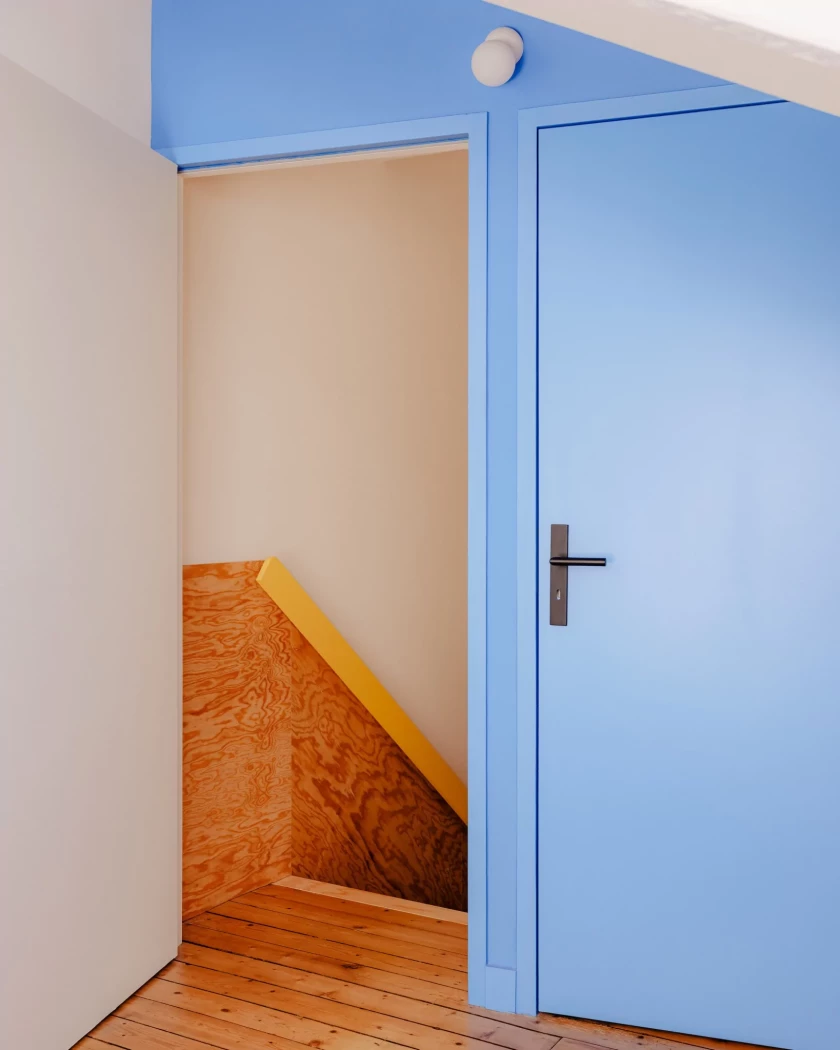 La nouvelle isolation venant réduire la hauteur sous plafond dans l'ensemble des espaces, le chien assis au centre du logement devient élément principal : il comprend ainsi l'arrivée de l'escalier, et la cloison de la salle de bain vient se positionner en biais afin d'y installer la porte de la salle de bain, le bureau, ou encore une bibliothèque.