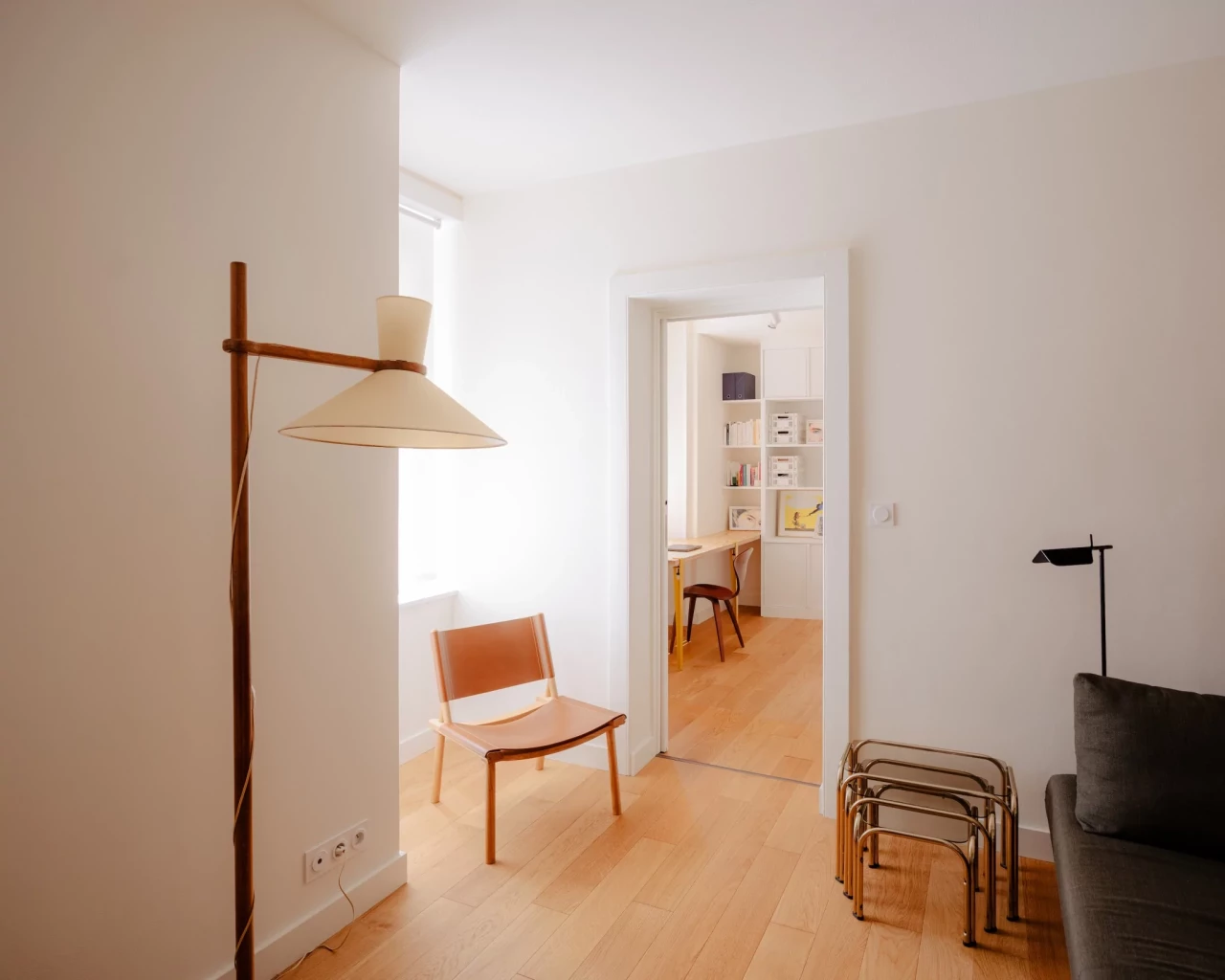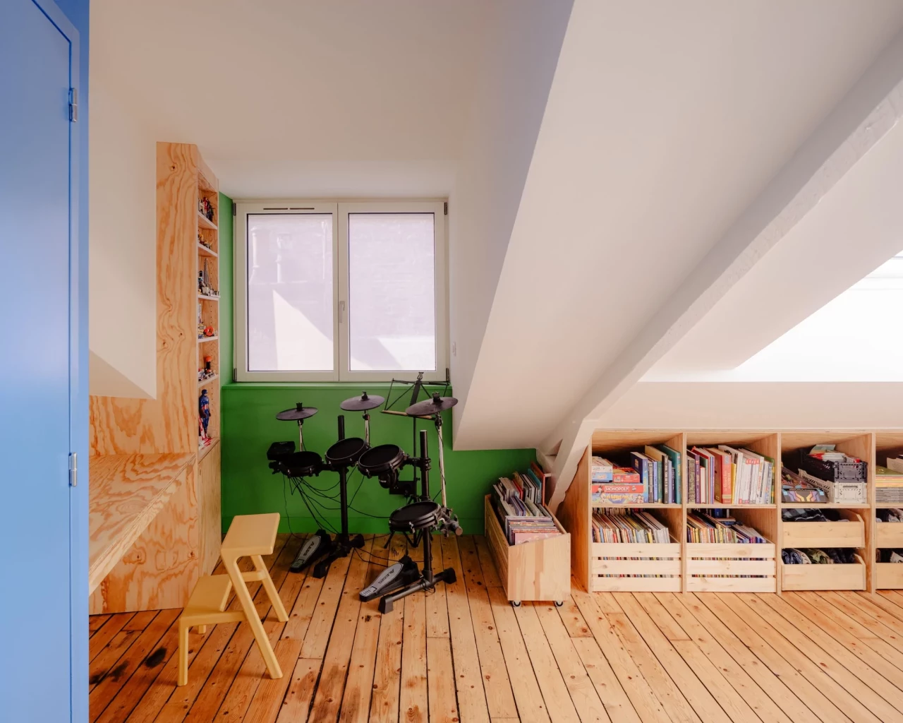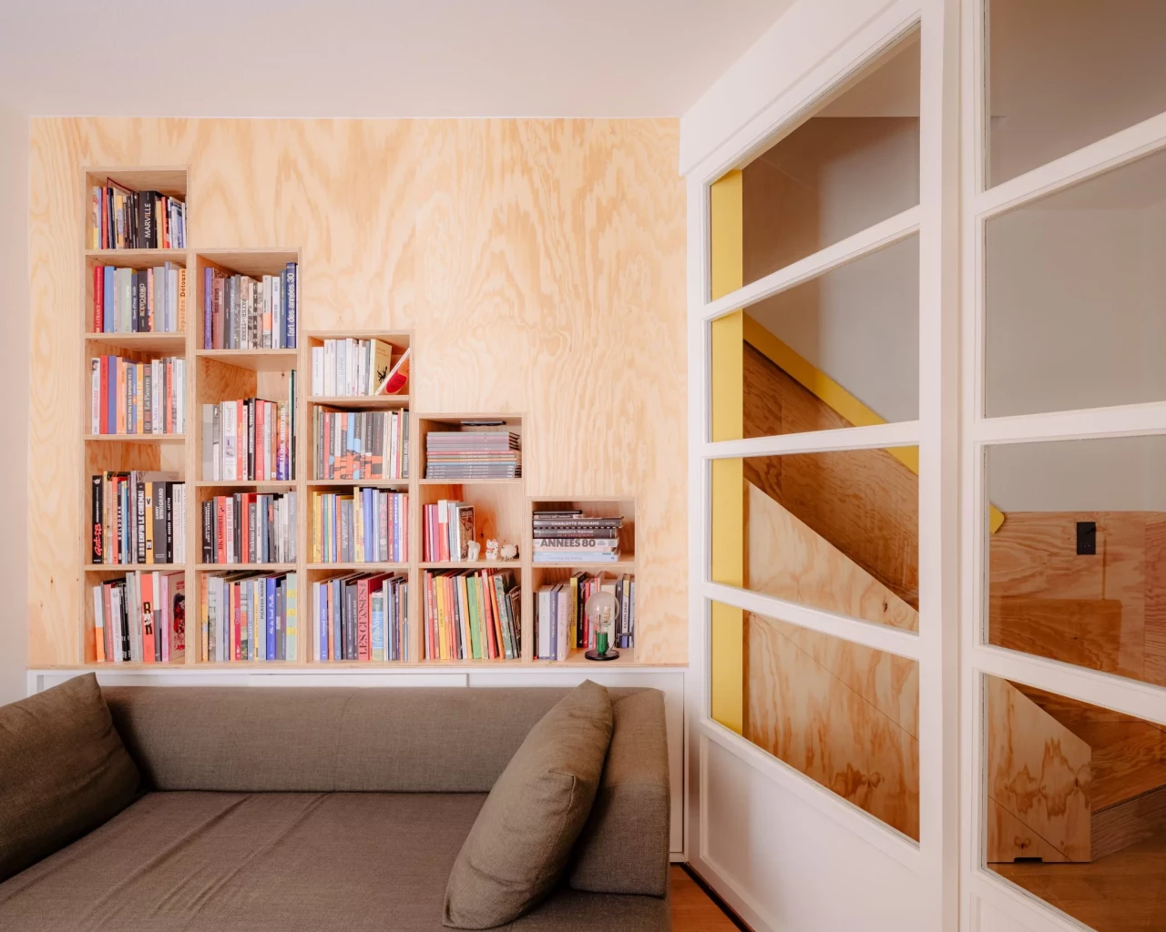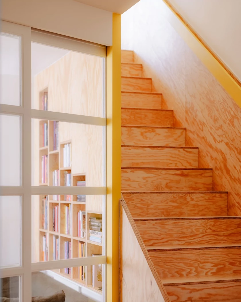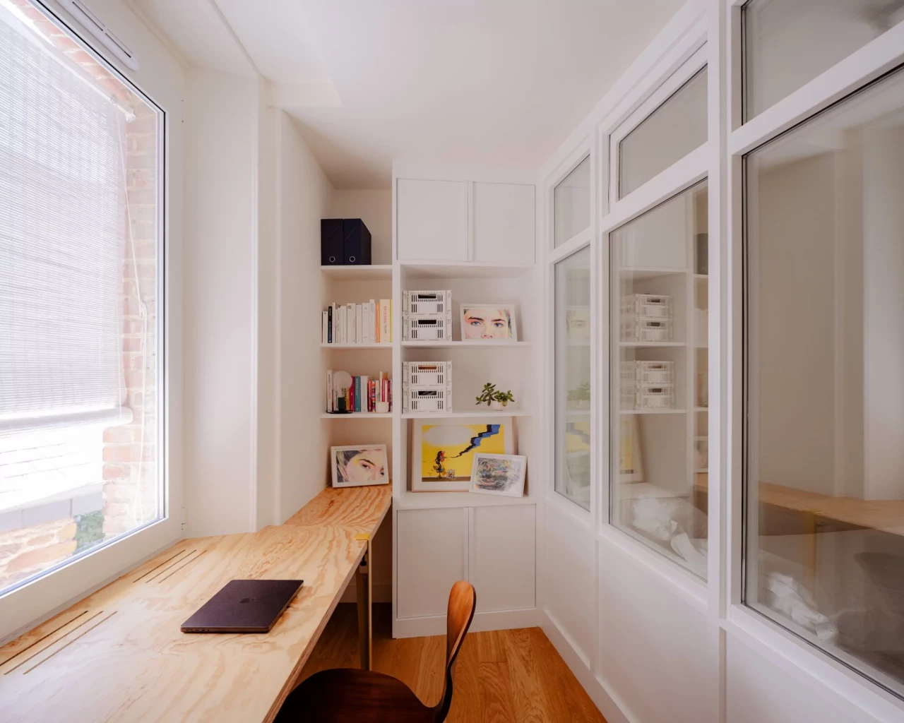 A l'étage principal, la redistribution des espaces permet l'installation d'un salon TV et d'une bibliothèque sous le nouvel escalier. La chambre autrefois partitionnée entre les parents et leur fils redevient une seule unité parentale. Une cloison légère réutilisant la paroi déposée vient permettre la création d'un coin bureau devant la fenêtre, isolant ainsi l'espace nuit.