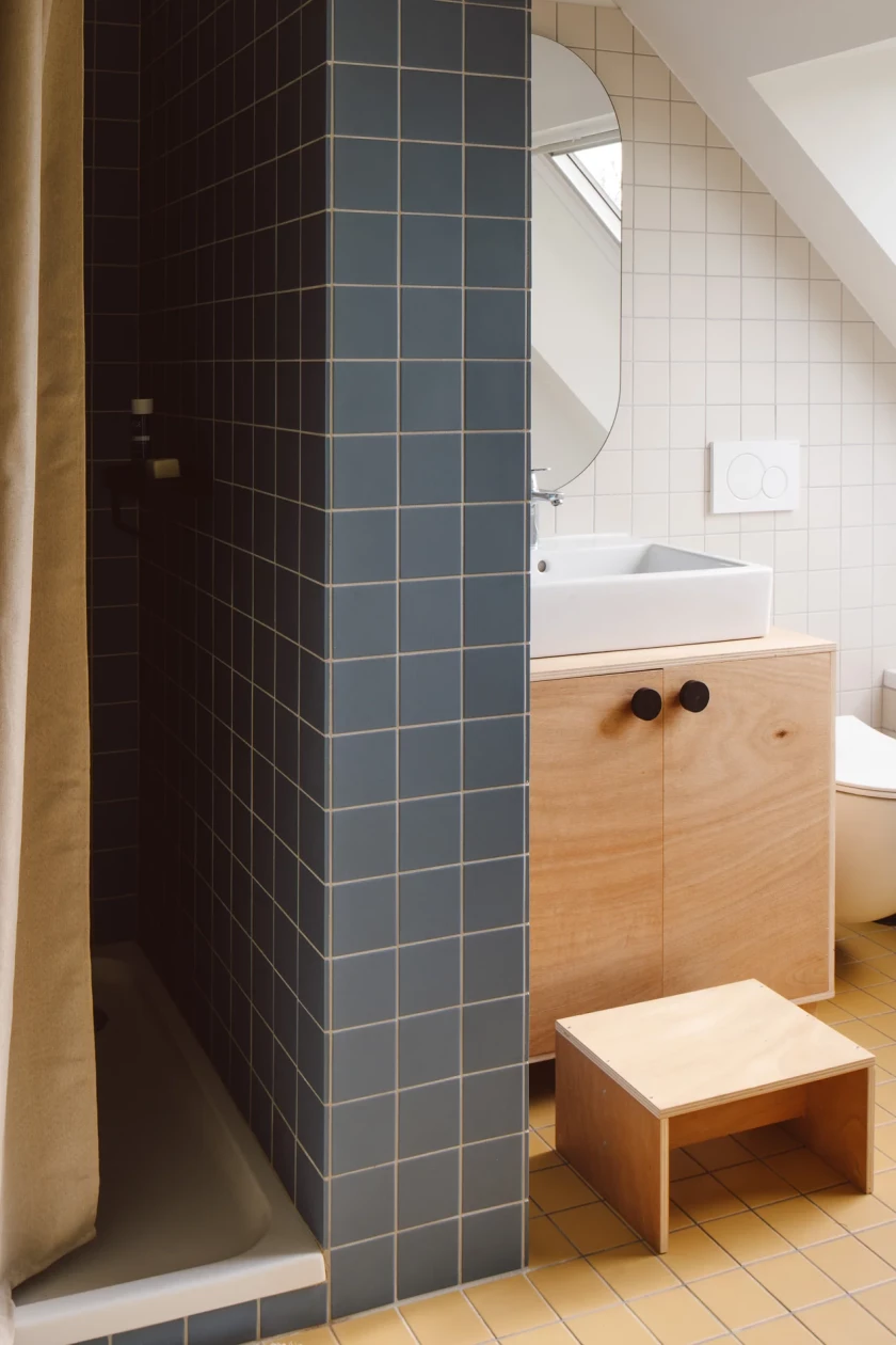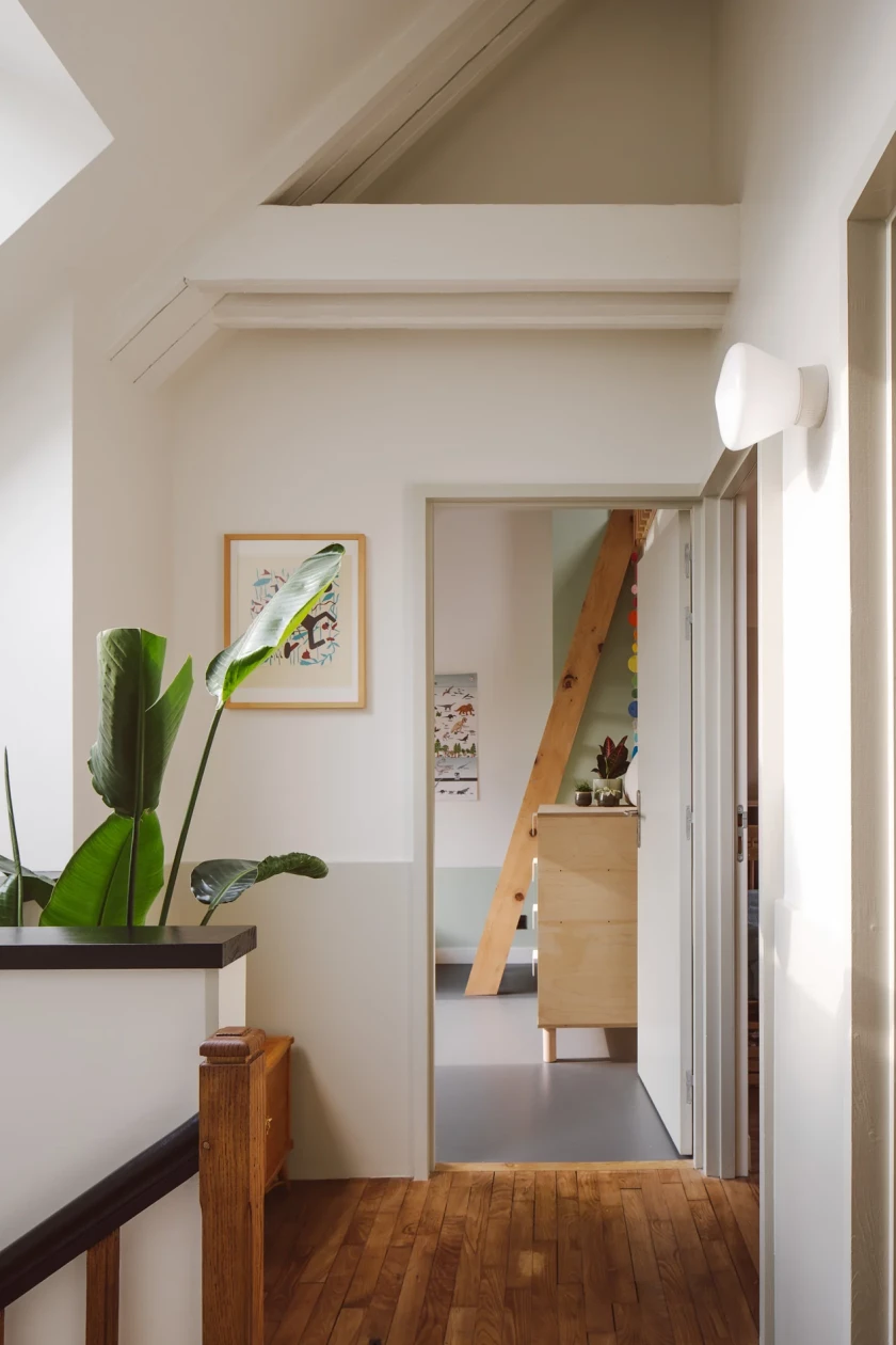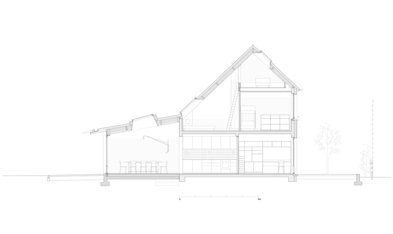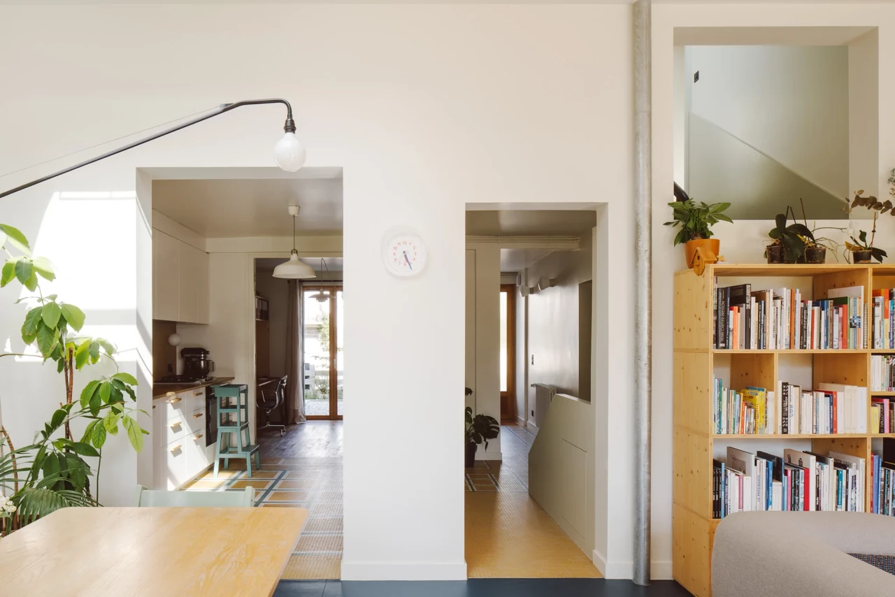Au souhait d’un salon, proposition est faite d’une extension d’un seul niveau, développée sur toute la largeur de la parcelle. Celle-ci s’ouvre entièrement sur le jardin, sa toiture avancée est la prolongation de la nouvelle couverture de la maison originale. La typologie générale de la maison est retravaillée avec minutie, les circulations deviennent plus fluides et de nouvelles percées viennent aérer l’ensemble auparavant très engoncé. Une salle de bain et trois chambres optimisées s’installent à l’étage, permettant à chaque enfant d’avoir en grandissant un espace à lui. Côté boulevard, une plateforme surélevée, ceinturée d’une haie composée d’espèces indigènes, permet de franchir un seuil vers la sphère privée de la maison.