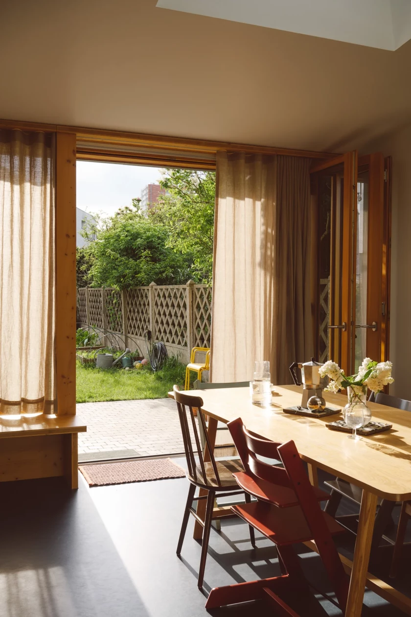 Pour répondre aux normes environnementales actuelles, la maison est isolée par l’extérieur en fibre de bois. Pour ne pas transgresser la composition de la façade existante, un travail sur les ouvertures existantes permet aux nouvelles d’en garder les proportions à l’étage et d’en augmenter la hauteur au rez-de-chaussée par suppression de l’allège.
